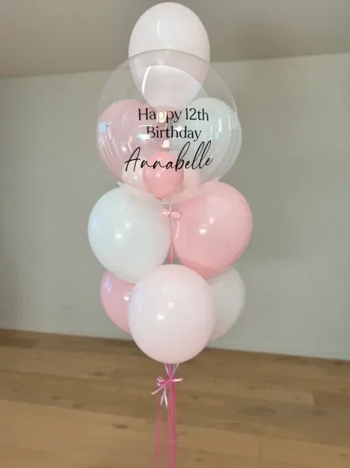 Gepersonaliseerde ballon in 1 mooi ballon bouquet.Het ballon bouquets bestaat uit 9 latex ballonnen en 1 gepersonaliseerde ballon.De Girl versie met twee kleuren roze ballonnen en wit.De Boy uitvoering met 2 kleuren blauw en wit.De ballonnen worden geleverd op een ballon gewicht. De latex ballonnen zijn behandeld met Hi-Float, waardoor deze minimaal 3 dagen zweven.